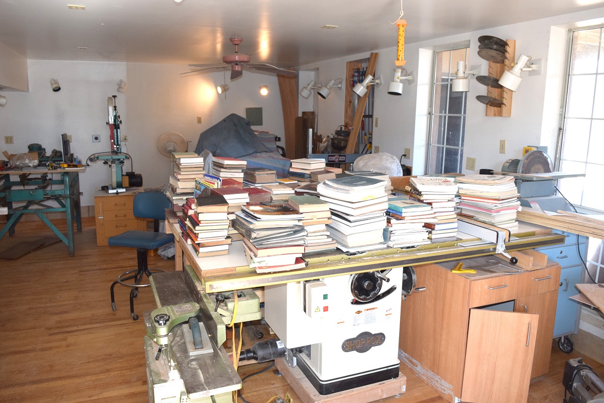 My last post on my library and the mess that it was in hit a few off note cords around here. No access to a great deal of my reference library and the mess all the rooms were in really pushed my buttons. Then boom I get a call from a general contractor ,that I did some work for, and he wants to get rid of some moving book cases. These are the type you see in large library’s only a 4 compartment set. He wants to know if I want them or not, of course we all know the answer to that. So I picked them up this morning and the days work was set. This is what the little room looked like before we re-worked it.