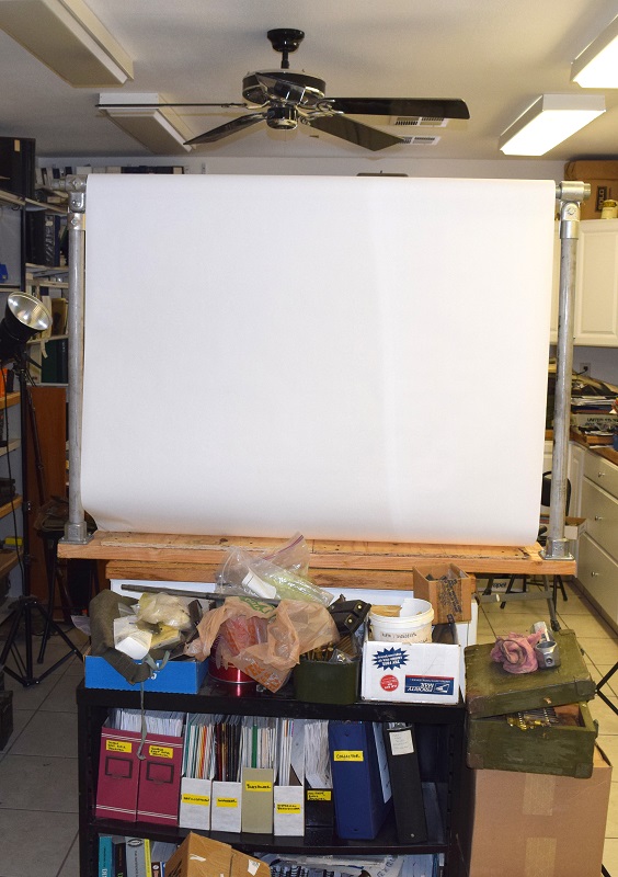 With the weather being bad all weekend it takes all the fun out of working outside. It was also impossible to bring in material of the project in the wood shop. To wet to go shooting. So what to do, that is the question. I continued working on improving my digital photography. I also went through my older pictures and scanned them to the computer, well about 1/2 of them. But that gets old quick so I needed something to make me feel like I did something productive this weekend. I decided to build a photo back drop in the pantry. I had enough material in the wood shop for it and I have been wanting one for awhile. The next task will be to build a mufti-function holding contraption. I got the idea from Reed Knight’s photographer.